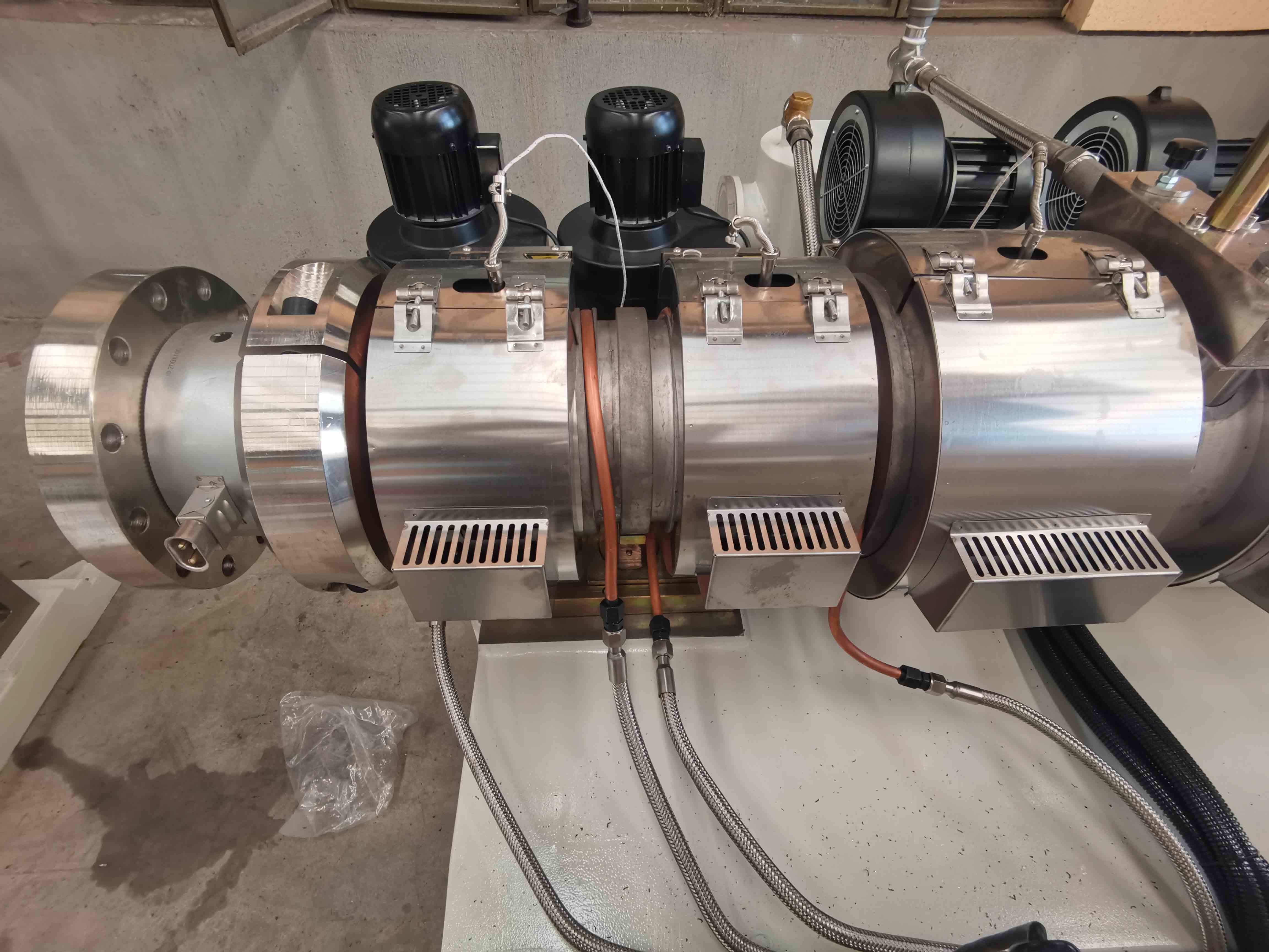 এই হোজ প্রোডাকশন লাইনটি এক্সট্রুডার, ওয়াটার ফ্লুম, বেল্ট হফ-অফ ইউনিট, থ্রেড ব্রেইডেড মেশিন এবং হোজ কয়েলার ইত্যাদি নিয়ে গঠিত। পিভিসি হোজ এক্সট্রুশন লাইনের যুক্তিসঙ্গত মিল, অনন্য গঠন, নির্ভরযোগ্য কর্মক্ষমতা, সহজ অপারেশন, সহজ রক্ষণাবেক্ষণ এবং অবিচ্ছিন্ন উত্পাদন ক্ষমতা রয়েছে। এক্সট্রুডার স্ক্রু এবং ব্যারেল নাইট্রাইড অ্যালয় স্টিলের তৈরি। ফিড জোনে জ্যাকেটেড ওয়াটার কুলিং সিস্টেম এবং ব্যারেলের সমস্ত জোনে এয়ার ব্লোয়ার দ্বারা কুলিং করা হয়। হিটারগুলি ব্যারেলের উপর মাউন্ট করা হয়।