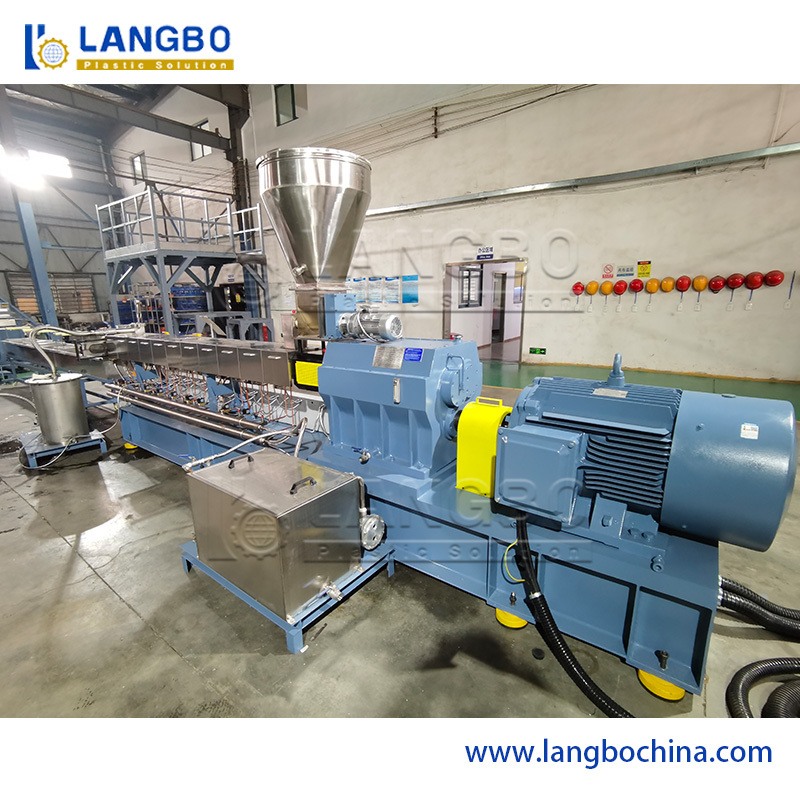 Raw material+ additive → Mixing → Conveying feeding → hopper feeding → Conical twin screw extruder → Hot face cutting → Cyclone separator → Vibration sieve → Blowing system → Storage hopper → Finished product packing