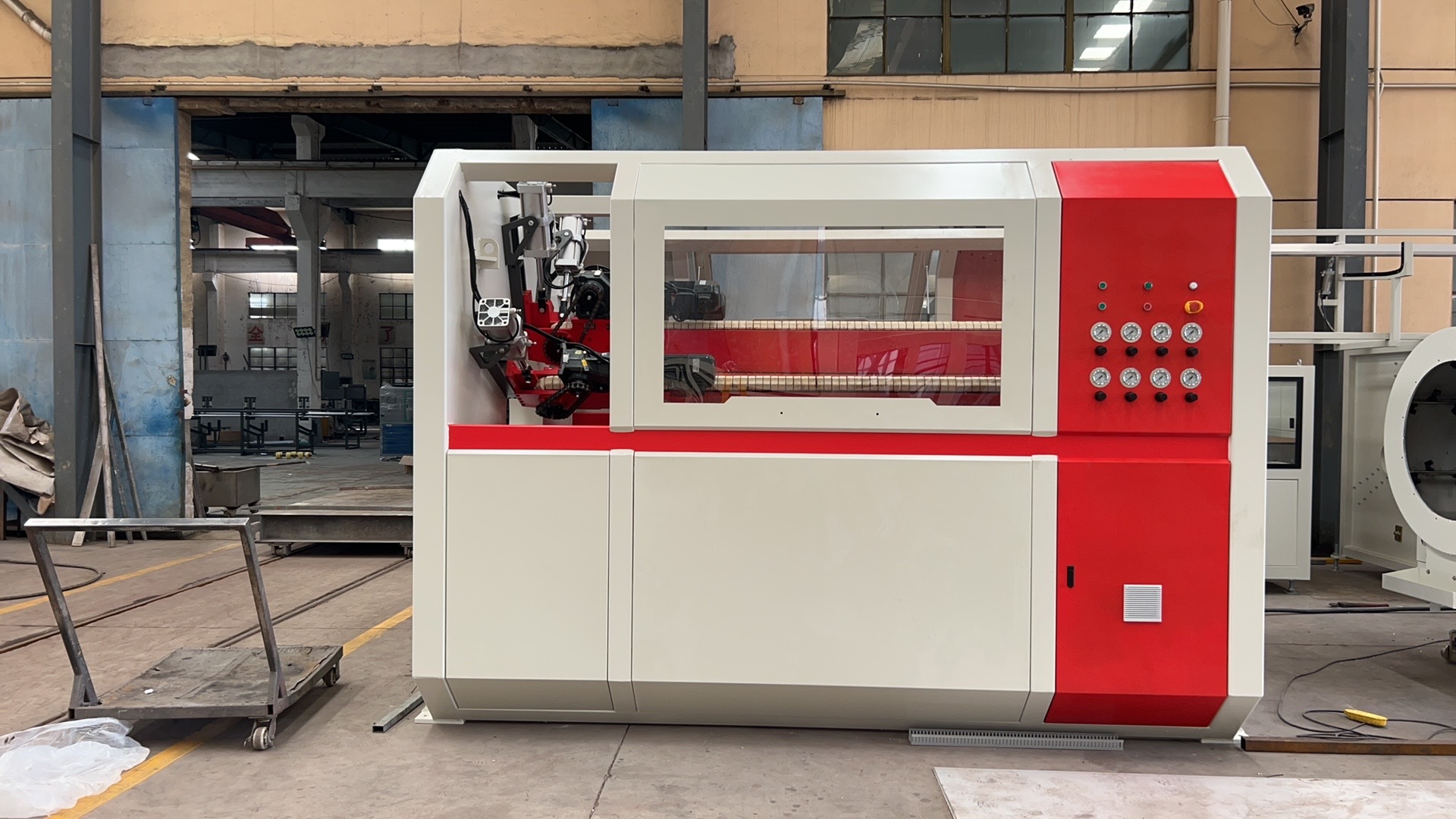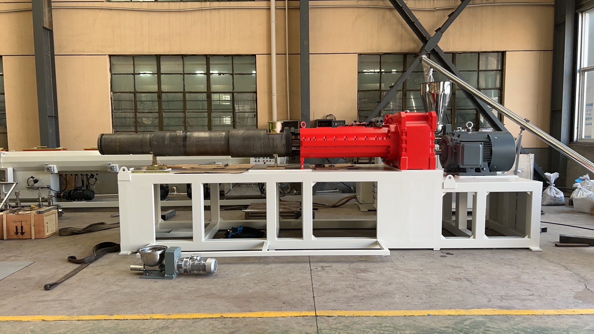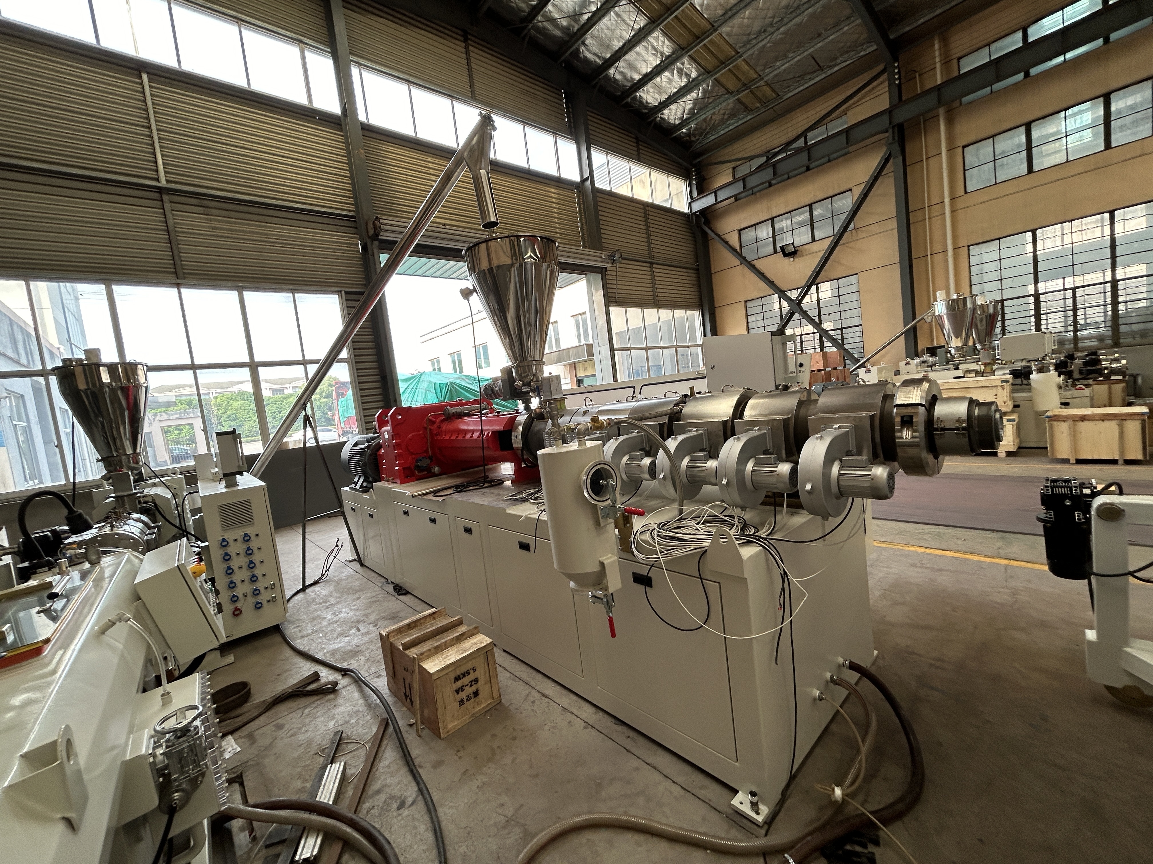 The first step of pipe production is the preparation of raw material. Customers can mix the PVC powder with other additives by themself. The mixture will be feeded into extruder. The material will be plasticized in the extruder and then be extruded into the mould. The material is shaped by mould and goes out with the pipe looking. The pipe extruded from the mould is hot and soft. The pipe with unstable shape will be calibrated and cooled by vacuum sleeve in the vacuum calibration tank. And then the pipe goes into the cooling tank for a further cooling. Haul off unit stands next to the cooling tank and take the pipe away from the extruder. According to the defined length, the pipe will be cut and then packed for transport.